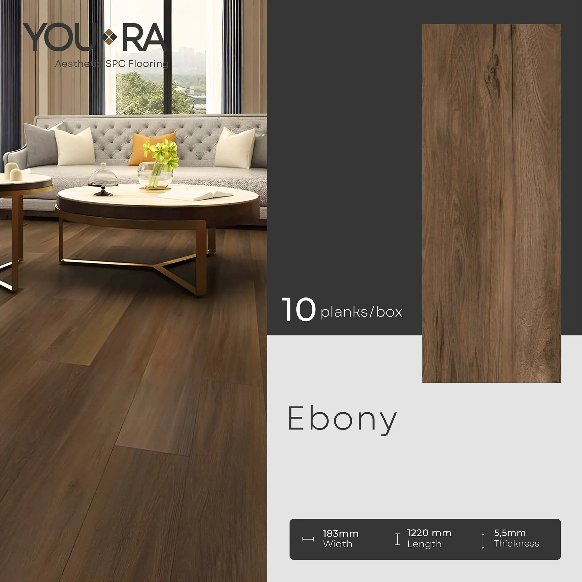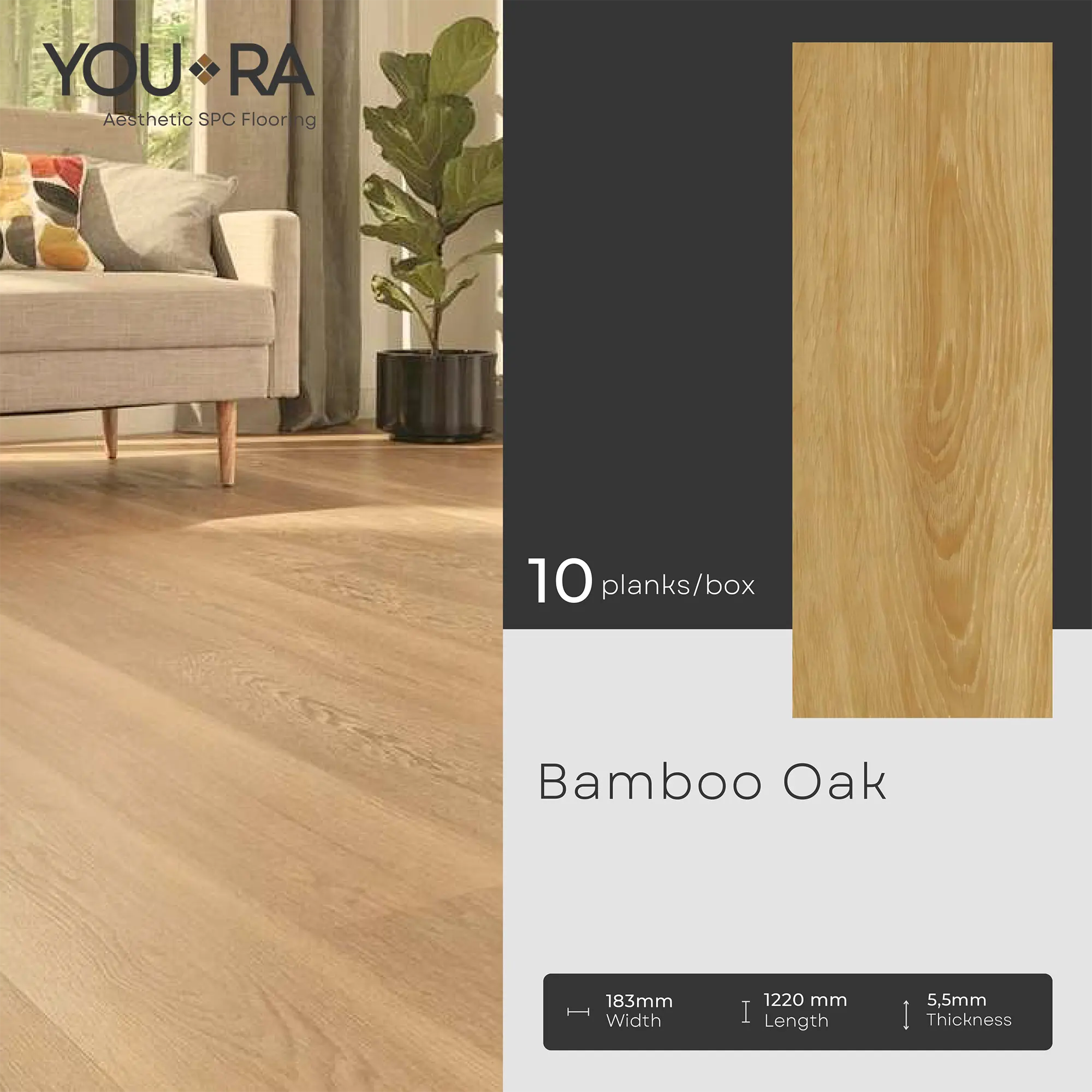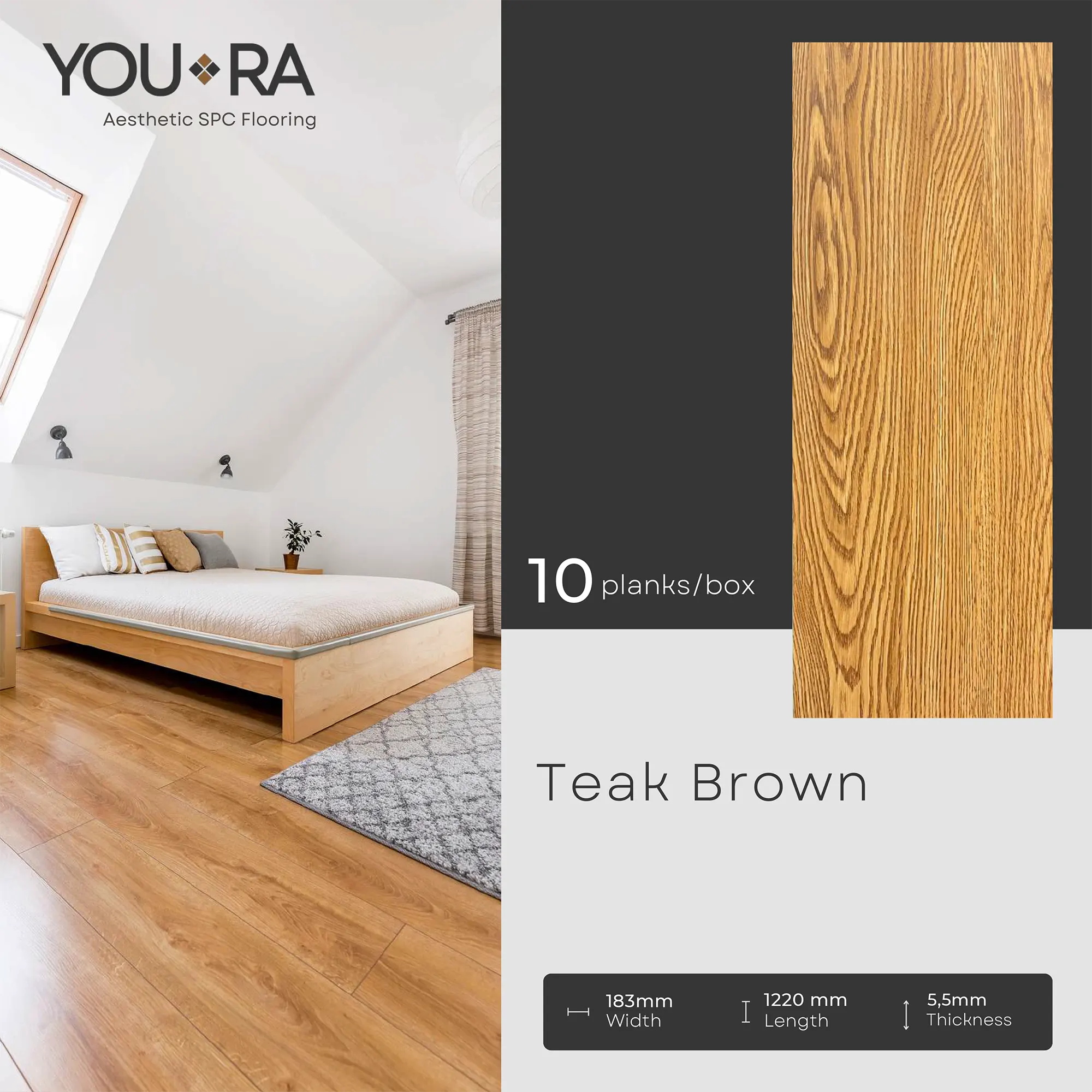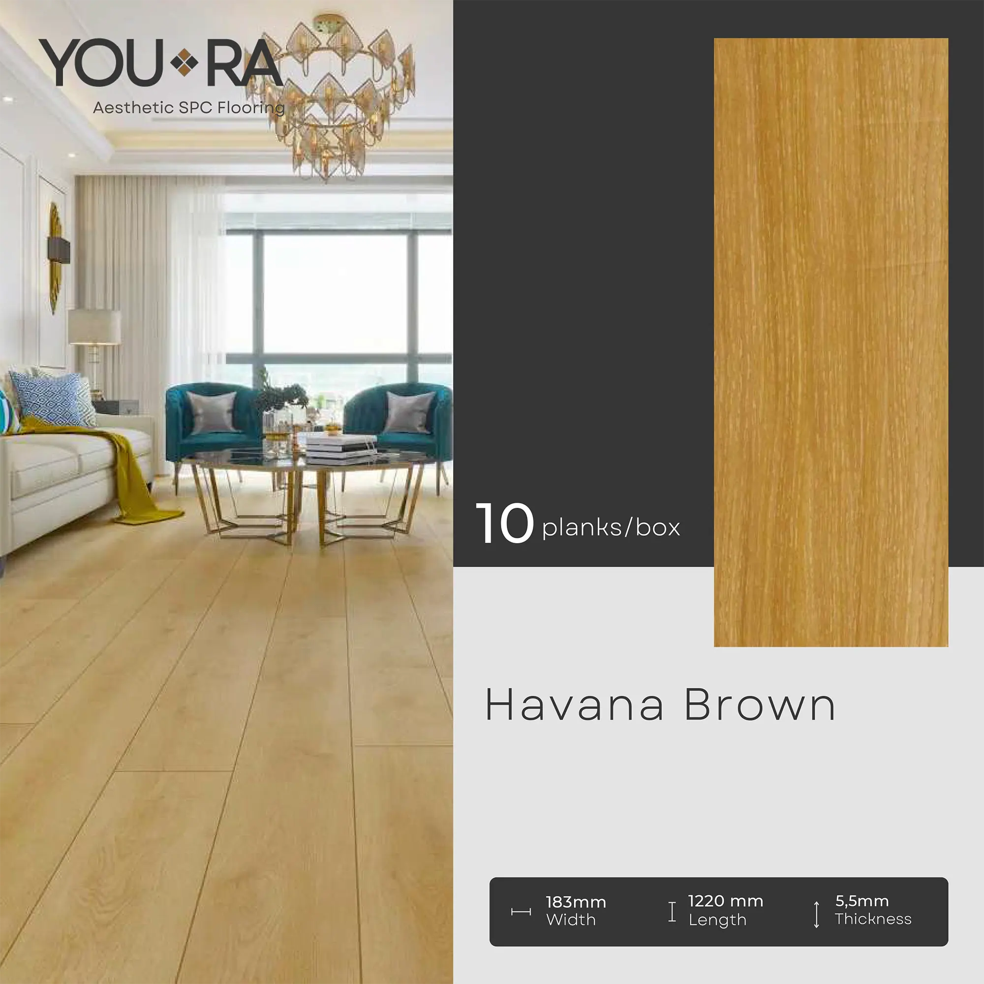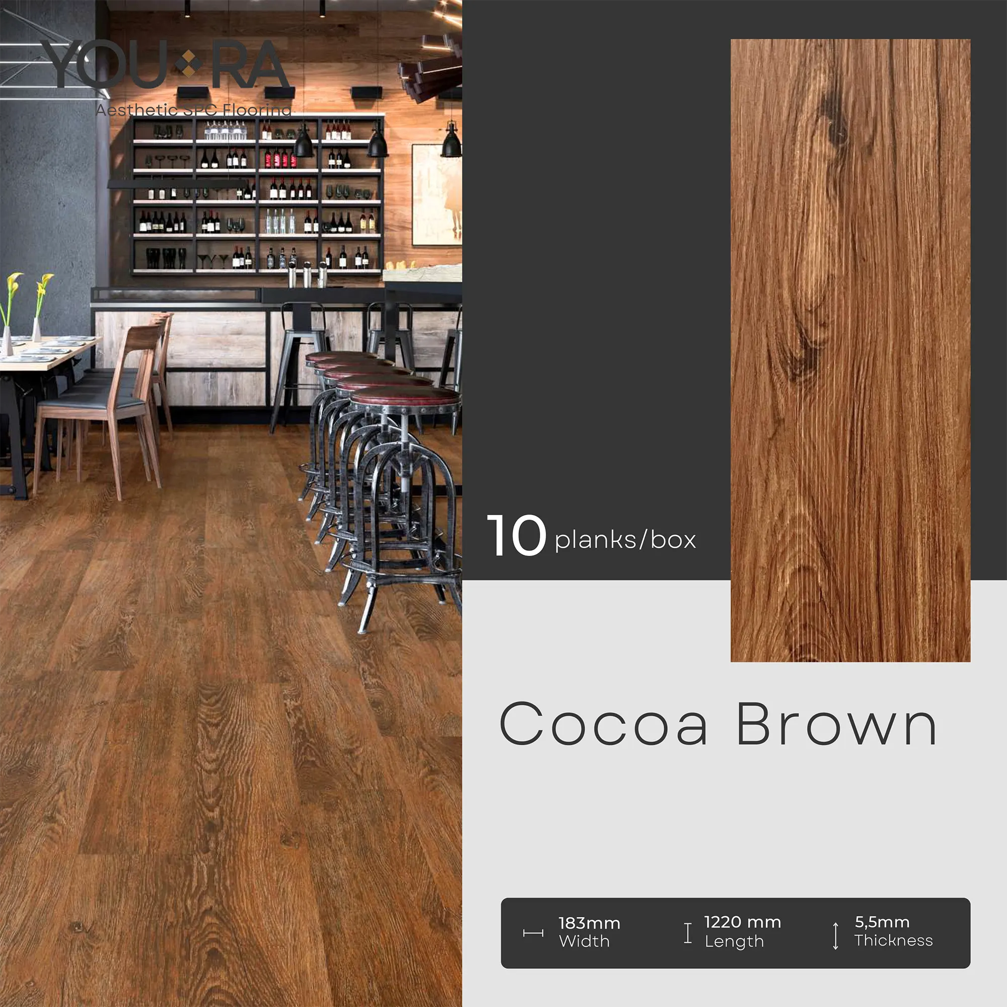 YOURA SPC Harga/box : Rp.387.000 | Harga/m² : Rp.173.543 Tebal : 5,5 mm | Size : 18 cm x 122 cm | Isi : 10 plank | Volume : 2,23 m²