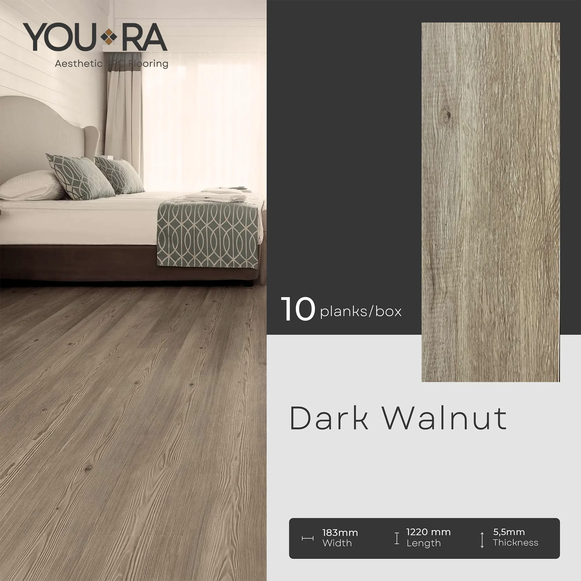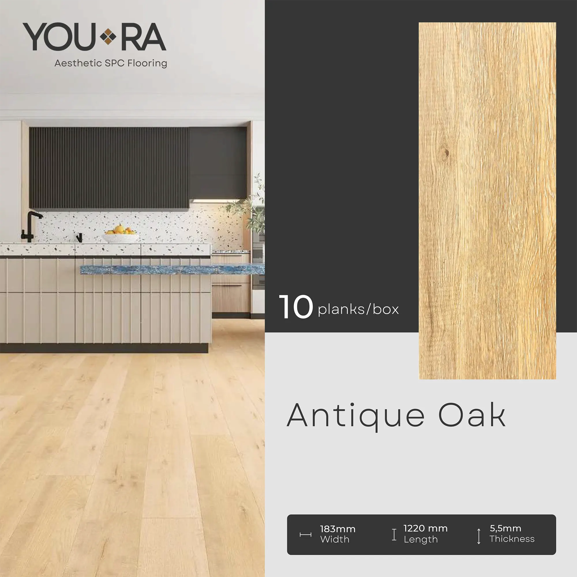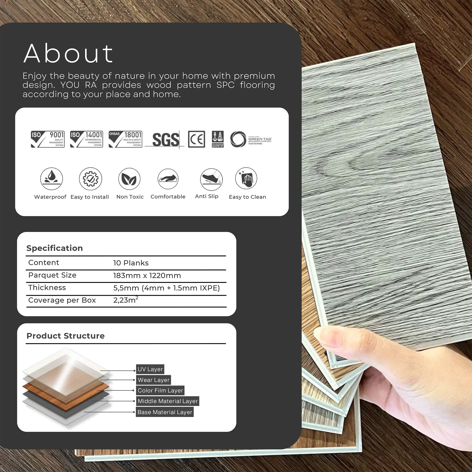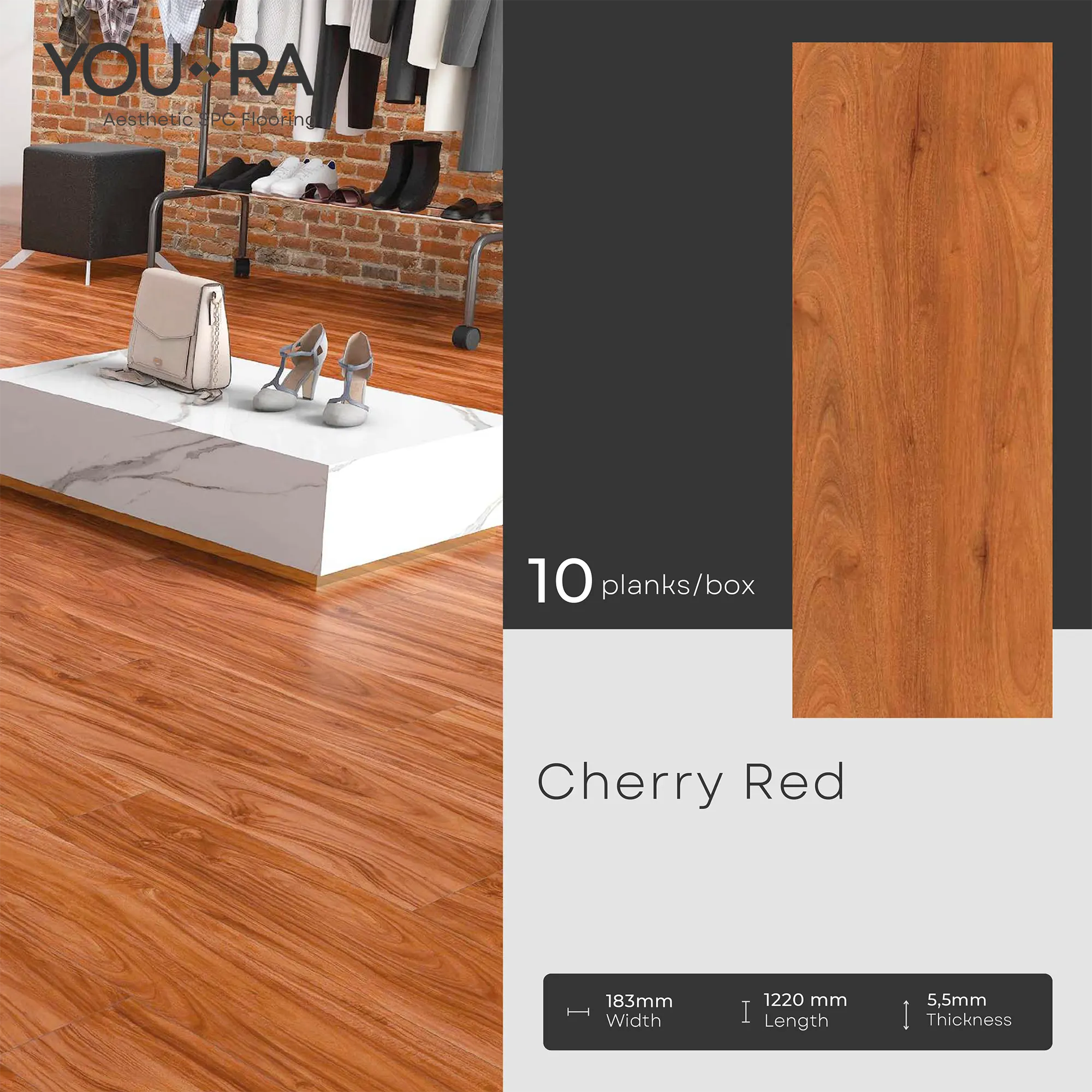 YOURA SPC Harga/box : Rp.387.000 | Harga/m² : Rp.173.543 Tebal : 5,5 mm | Size : 18 cm x 122 cm | Isi : 10 plank | Volume : 2,23 m²