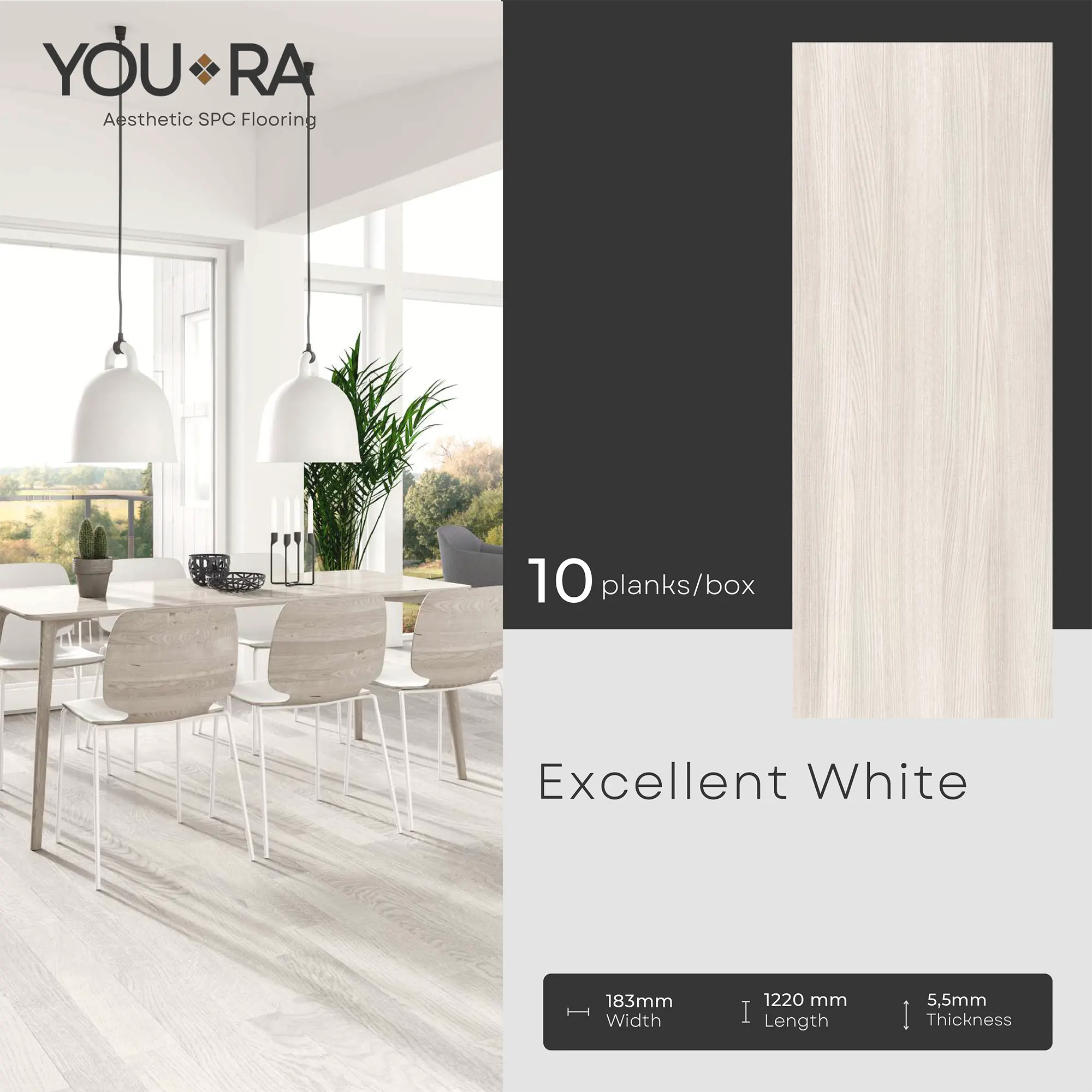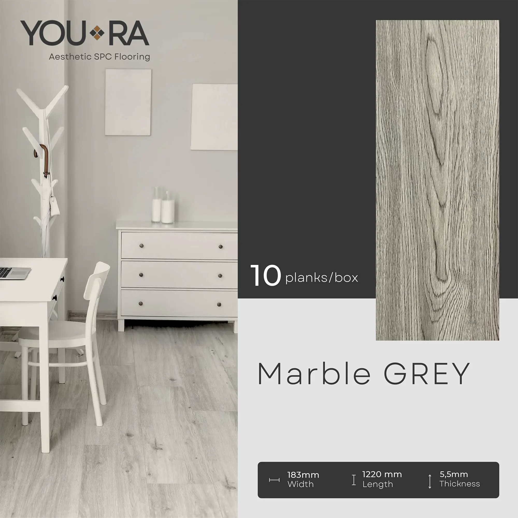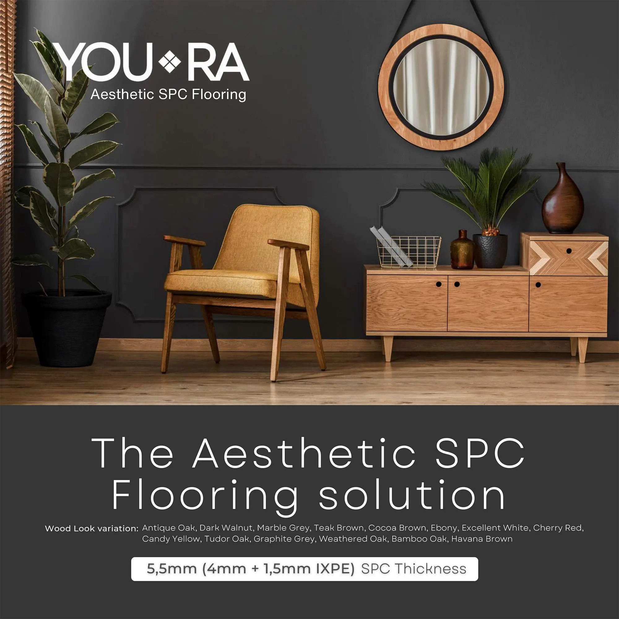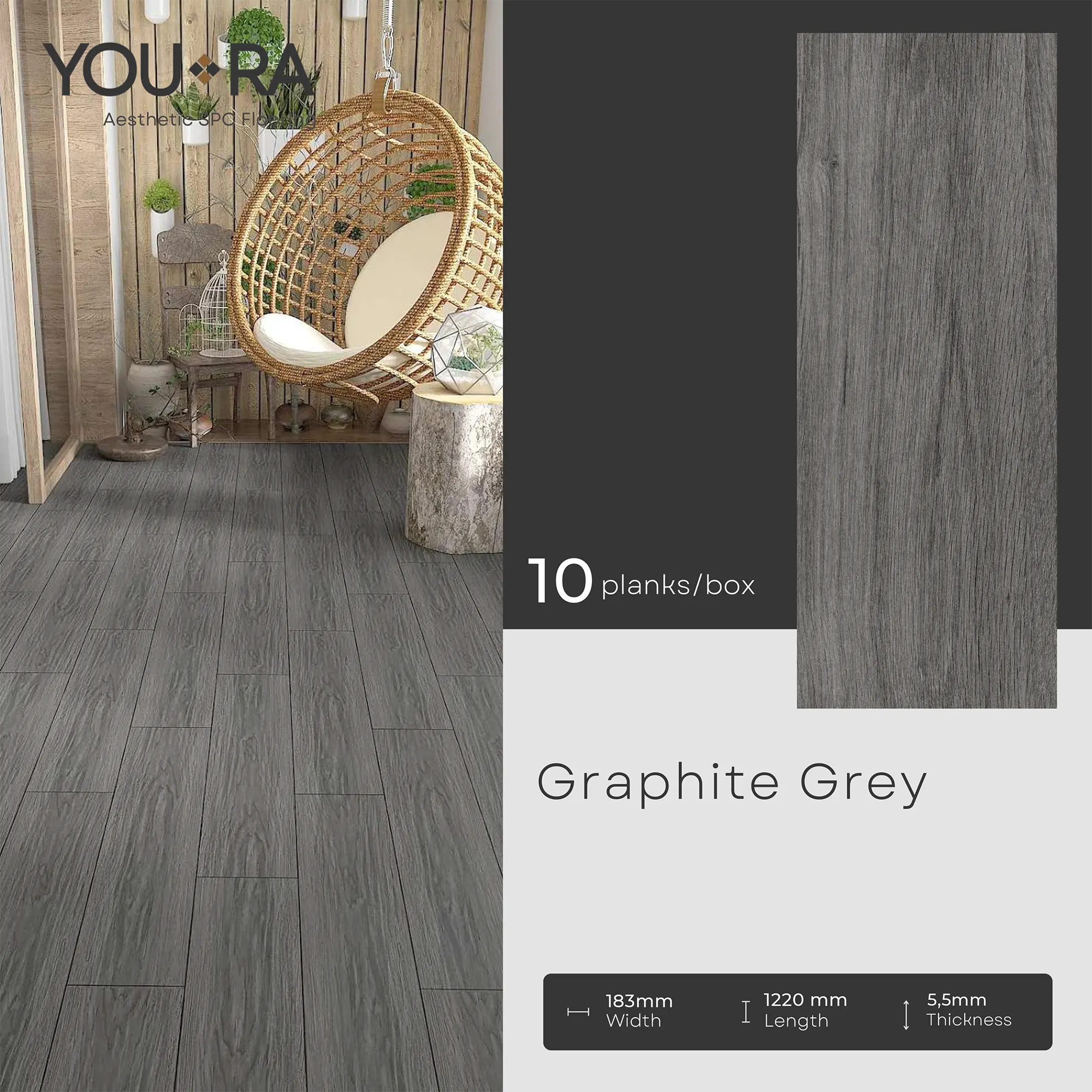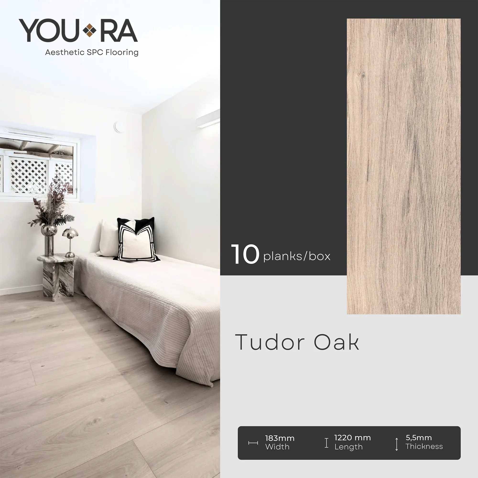 YOURA SPC Harga/box : Rp.387.000 | Harga/m² : Rp.173.543 Tebal : 5,5 mm | Size : 18 cm x 122 cm | Isi : 10 plank | Volume : 2,23 m²